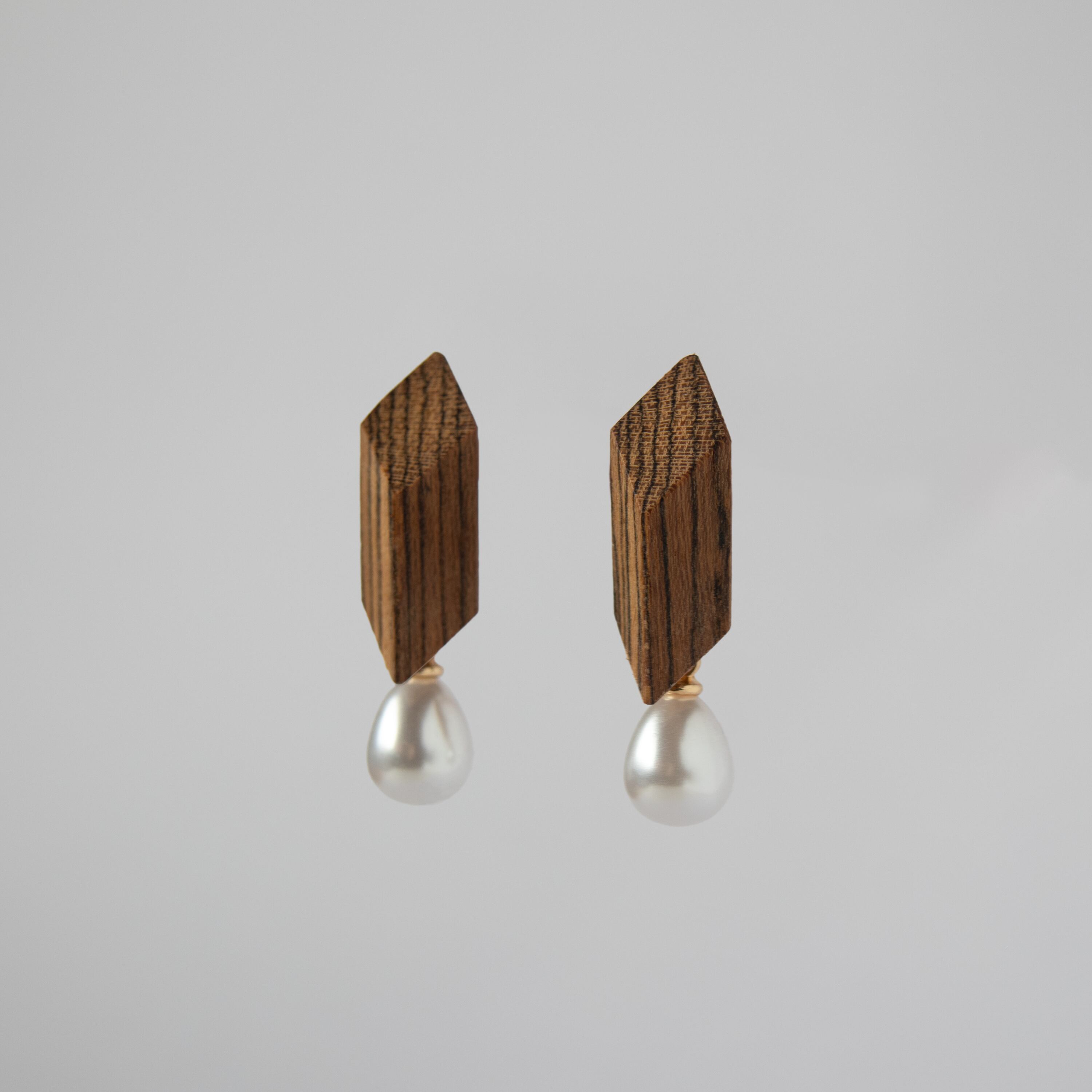 ボコーテはそのはっきりとしたストライプ状の木目が人気で、ギターなどの楽器の素材として長らく愛されてきた素材です。ピアスの先端にガラスパールを組み合わせ、質感や色味のコントラストでよりお互いを引き立て合うようにデザインしました。